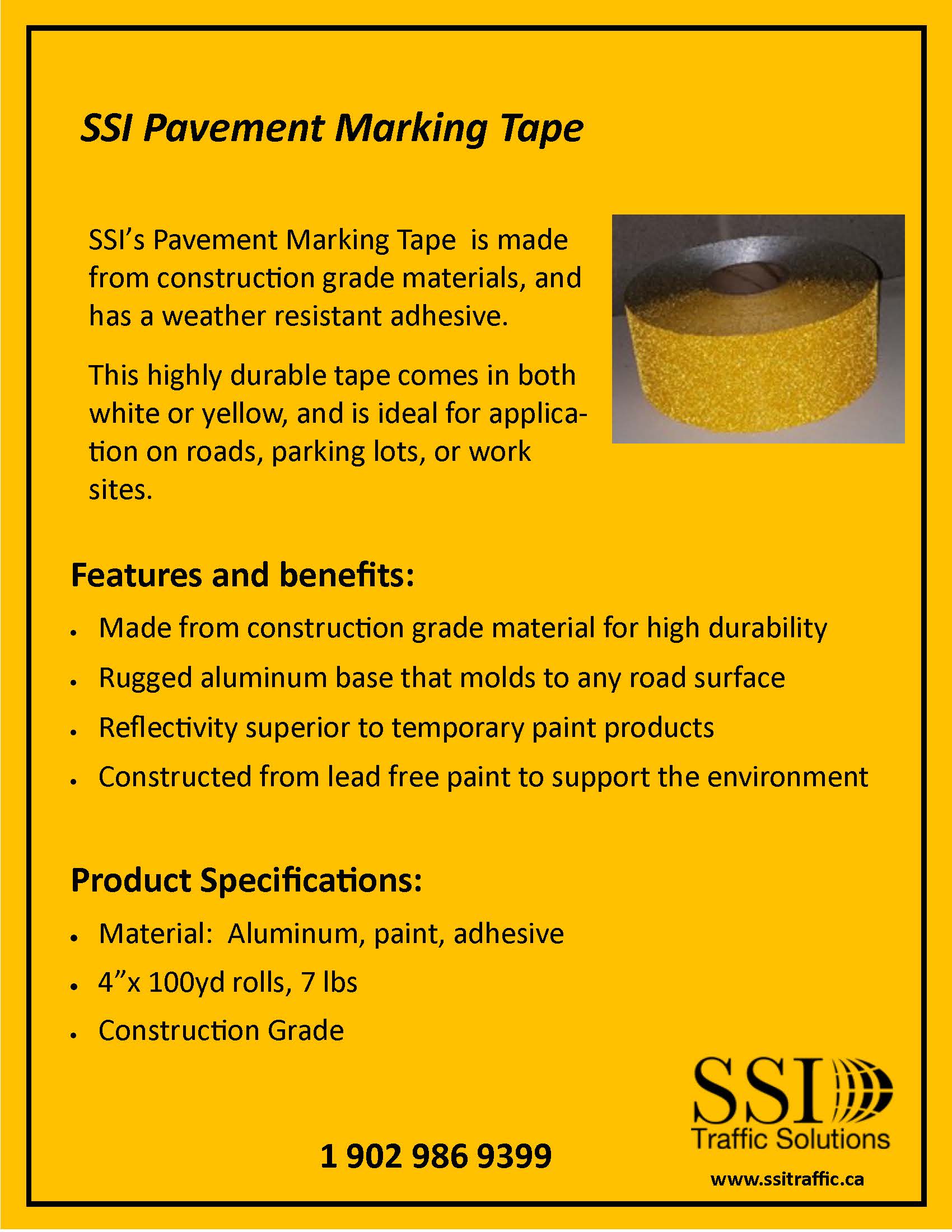 SSI’s Pavement Marking Tape is a premium quality product, designed for excellent conformability, and manufactured from highly reflective materials providing excellent nighttime delineation in a variety of weather conditions. Our Pavement Marking Tape comes in both white and yellow.