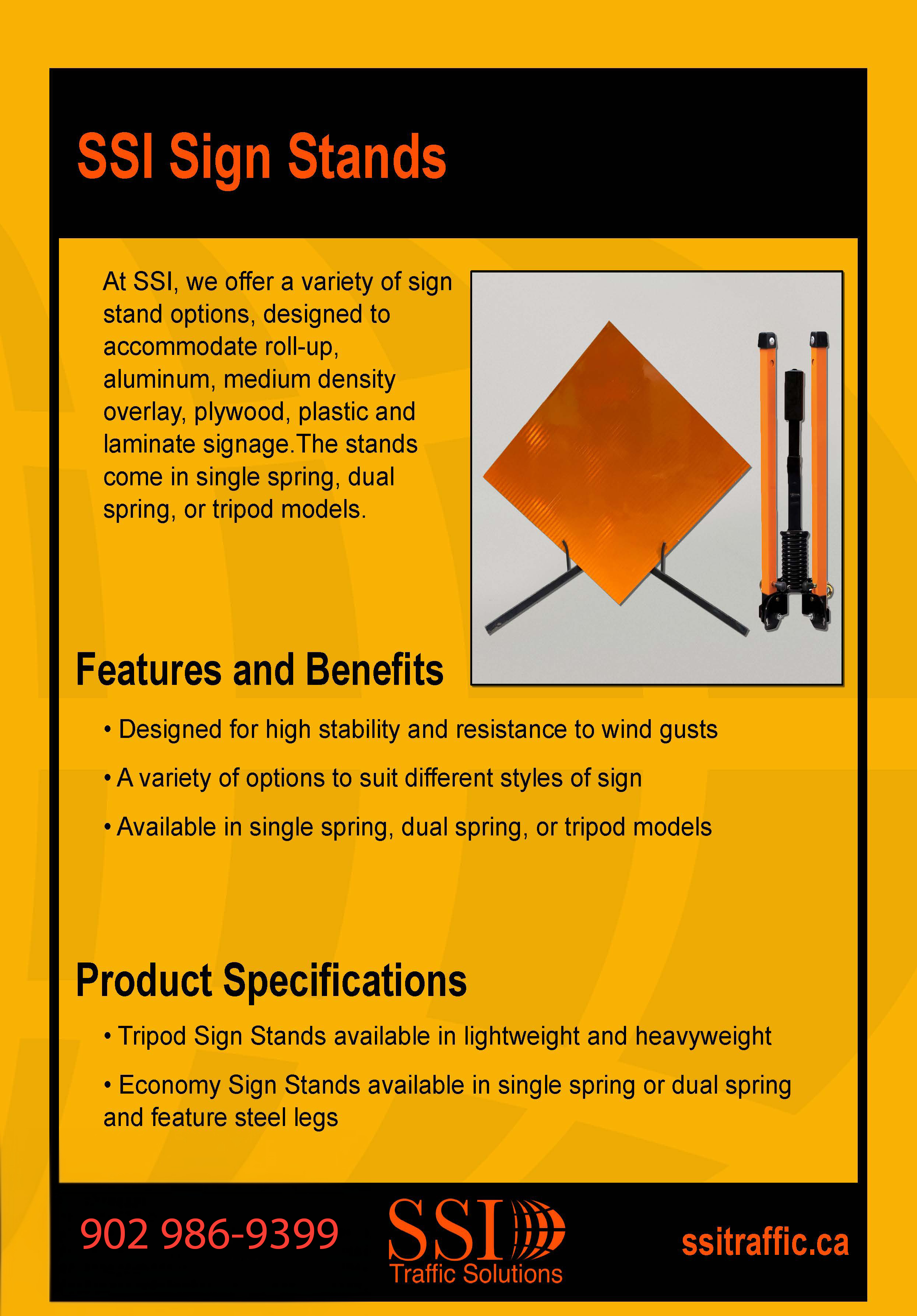 At SSI, we offer a variety of sign stand options, designed to accommodate roll-up, aluminum, medium density overlay, plywood, plastic and laminate signage. The stands come in single spring, dual spring, or tripod models. The spring models are designed for high stability and resistance to wind gusts.